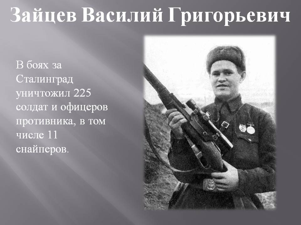 В ходе битвы за Сталинград прославился советский снайпер Василий Зайцев, который был не только метким стрелком, но и мастером трюков и «обманок». За 38 дней он уничтожил 225 фашистов, причем одиннадцать из них, как и он, были снайперами. За голову Зайцева фашисты назначали большую награду.