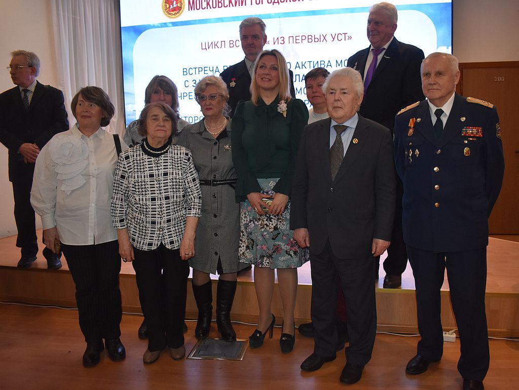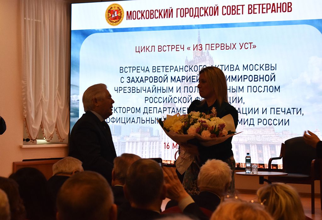 В конференц-зале Московского городского Совета ветеранов состоялась встреча ветеранского актива Москвы с Захаровой Марией Владимировной — Чрезвычайным и Полномочным Послом Российской Федерации директором информации и печати, официальным представителем  МИД России.